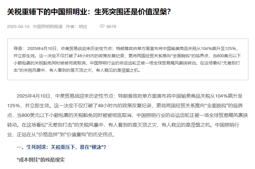 2025年4月10日,中美貿(mào)易戰(zhàn)迎來(lái)歷史性節(jié)點(diǎn):特朗普政府單方面宣布將中國(guó)輸美商品關(guān)稅從104%飆升至125%,并立即生效。這一決定不僅打破了48小時(shí)內(nèi)的政策反復(fù)紀(jì)錄,更將兩國(guó)經(jīng)貿(mào)關(guān)系推向“全面脫鉤”的臨界點(diǎn),當(dāng)800美元以下小額包裹的關(guān)稅豁免同時(shí)被被徹底取消,中國(guó)照明行業(yè)的命運(yùn)齒輪正被一場(chǎng)全球貿(mào)易颶風(fēng)裹挾轉(zhuǎn)動(dòng)。在這場(chǎng)看似“無(wú)差別打擊”的關(guān)稅風(fēng)暴中,有人看到的是滅頂之災(zāi),有人窺見(jiàn)的是涅槃之機(jī)。中國(guó)照明行業(yè),正站在從“價(jià)格血拼”到“價(jià)值重構(gòu)”的歷史拐點(diǎn)。
