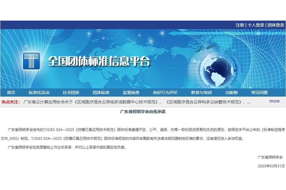 據(jù)全國(guó)團(tuán)體標(biāo)準(zhǔn)信息平臺(tái)官網(wǎng)消息,廣東省照明學(xué)會(huì)近期正式發(fā)布了T/GIES 024—2025《防爆燈具應(yīng)用技術(shù)規(guī)范》團(tuán)體標(biāo)準(zhǔn)。自發(fā)布之日起,該標(biāo)準(zhǔn)正式實(shí)施。
