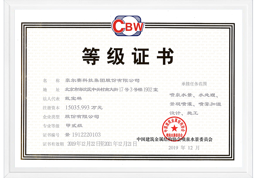 豪爾賽集團是國內(nèi)首批擁有住房和城鄉(xiāng)建設(shè)部頒發(fā)的"照明工程設(shè)計專項甲級資質(zhì)"和"城市及道路照明工程專業(yè)承包壹級資質(zhì)"的公司,并具備“噴泉水景、水處理、景觀噴灌、噴霧加濕設(shè)計、施工甲級”資質(zhì)證書。公司通過了 GB/T19001-2016 idt ISO9001:2015 & GB/T50430-2017質(zhì)量管理、 GB/T 2401-2016 idt ISO14001:2015 環(huán)境管理、 GB/T 45001-2020 idt ISO45001:2018 職業(yè)健康安全管理等體系認證、且獲得國家權(quán)威資信評估機構(gòu)的AAA資信等級認證。